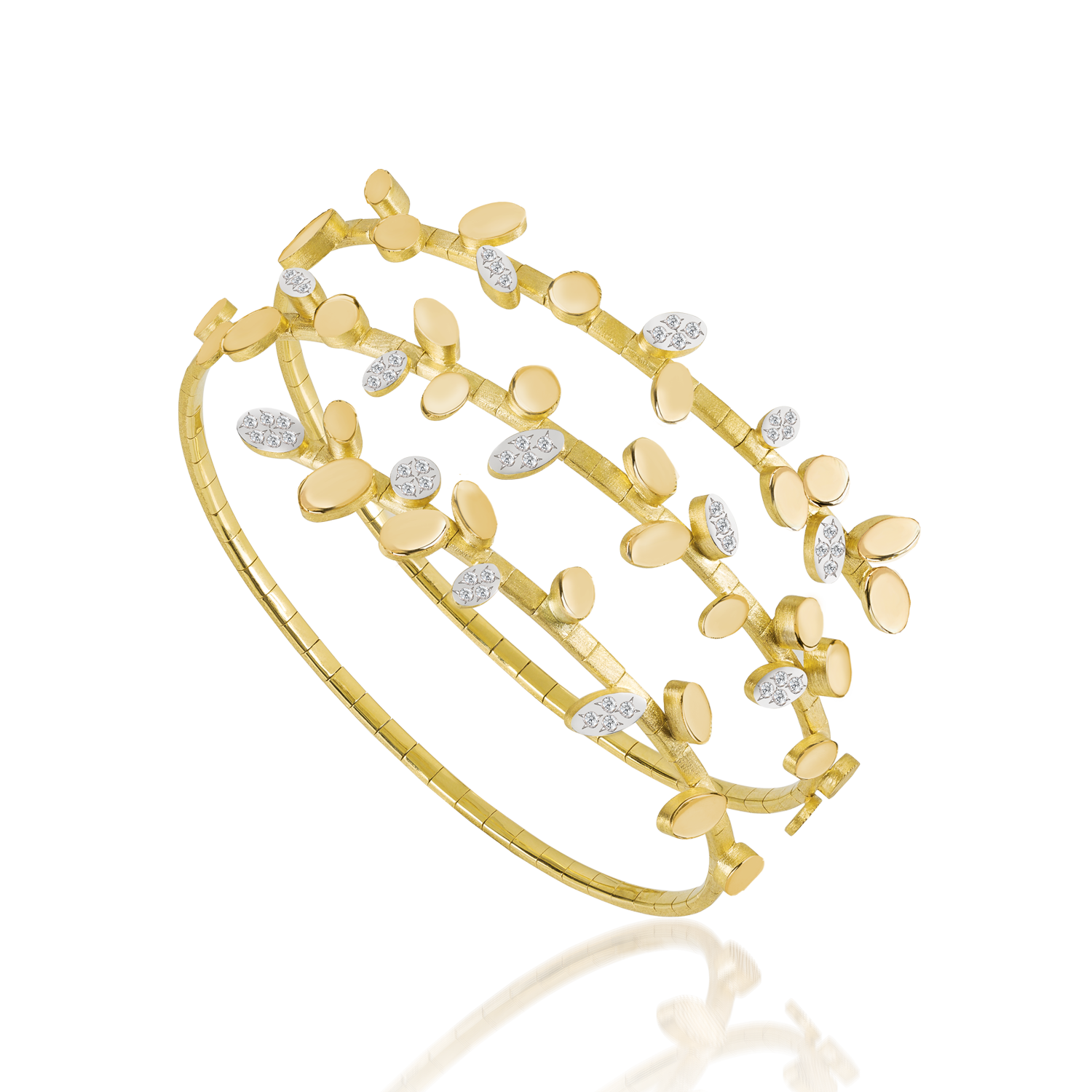 Three-band spiral bracelet in 18K yellow gold with diamonds.
